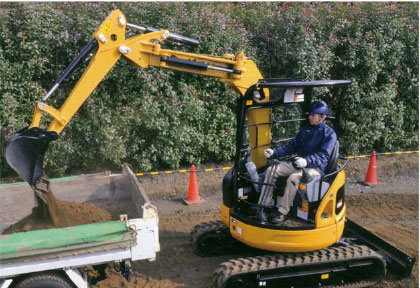 狭い場所での旋回時でも車体後部がクローラ幅内に収まるため後方を気にせず旋回できる超小旋回型。フロント旋回半径も小さくコンパクトな機体で狭い現場でもフル稼働します。